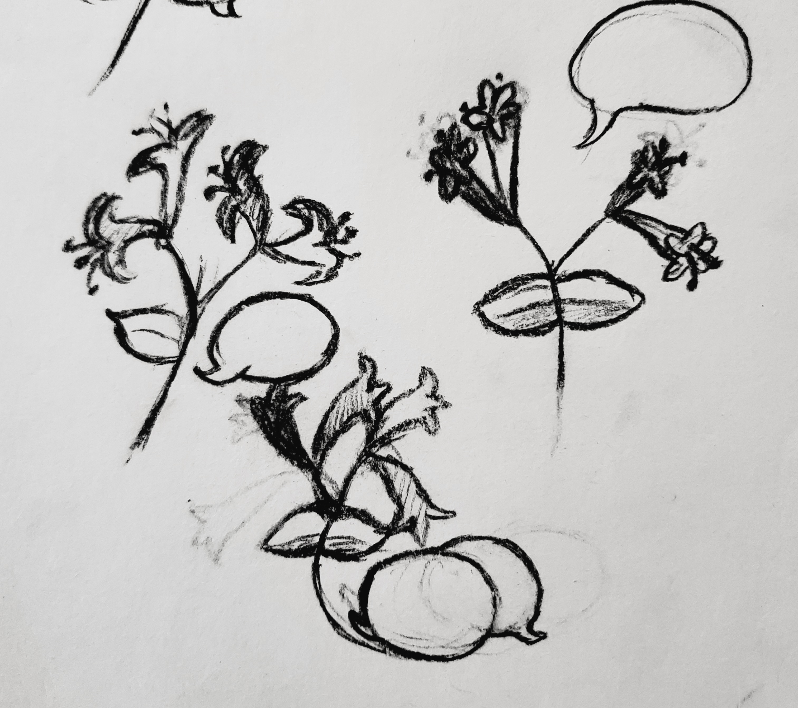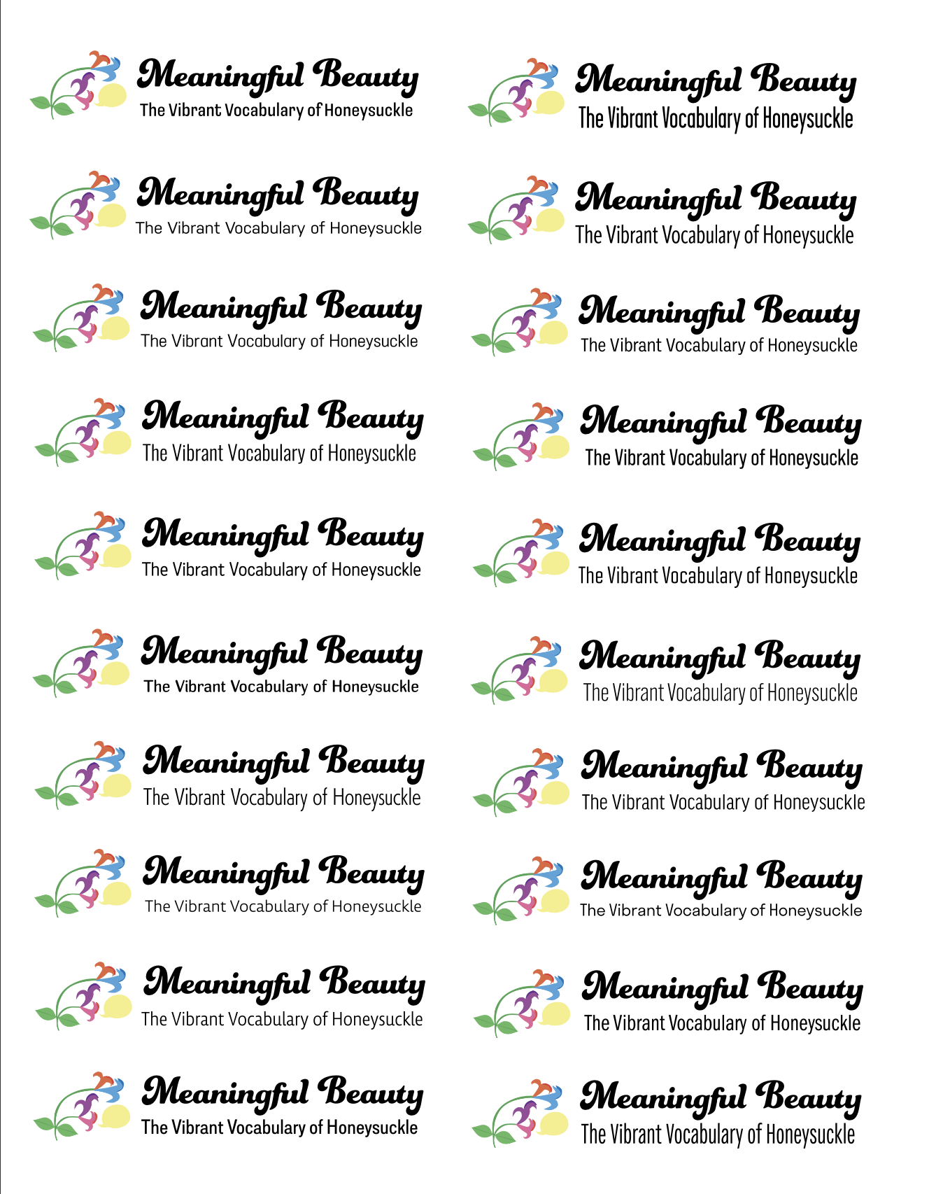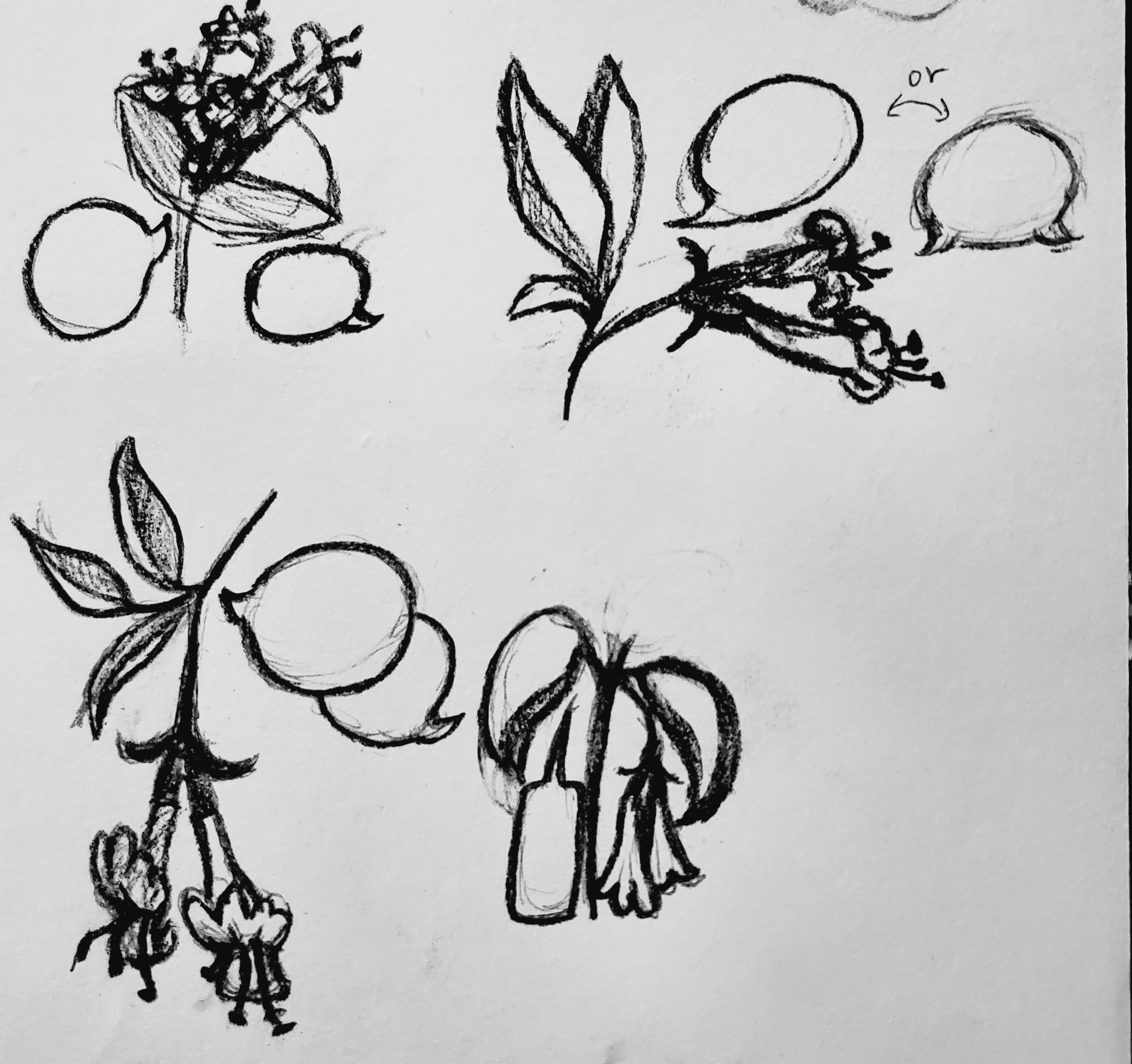After this point the exhibit finally had an established name: "Meaningful Beauty: The Vibrant Vocabulary Of Honeysuckles". With the name established my sketches from here on out focused more on the logomark. I did sketches of many different honeysuckles, some were in a more simple minimal style but it seemed too stiff to give off the fun tone we were going for. I was given feedback and from that I started to experiement with the different ways a speech bubble could be incorporated into the logomark.